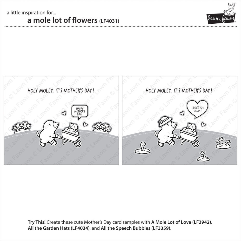 Wheel in sweet Mother’s Day wishes with our newest mole friend! This set includes a selection of the sweetest images for the inside of your barrow. Perfect for Mother’s Day, Spring, or anytime cards this set will be an amazing addition to your mole collection.